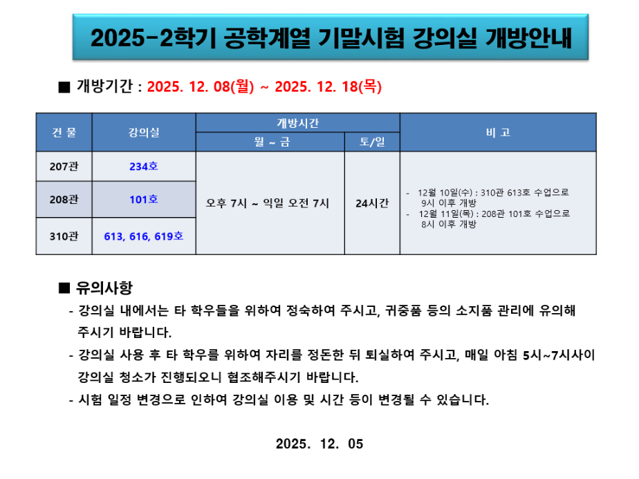 | 현재글 | 2025-2학기 기말시험 강의실 개방 안내 | 관리자 | 2025-12-05 10:13:42 | 1389 |